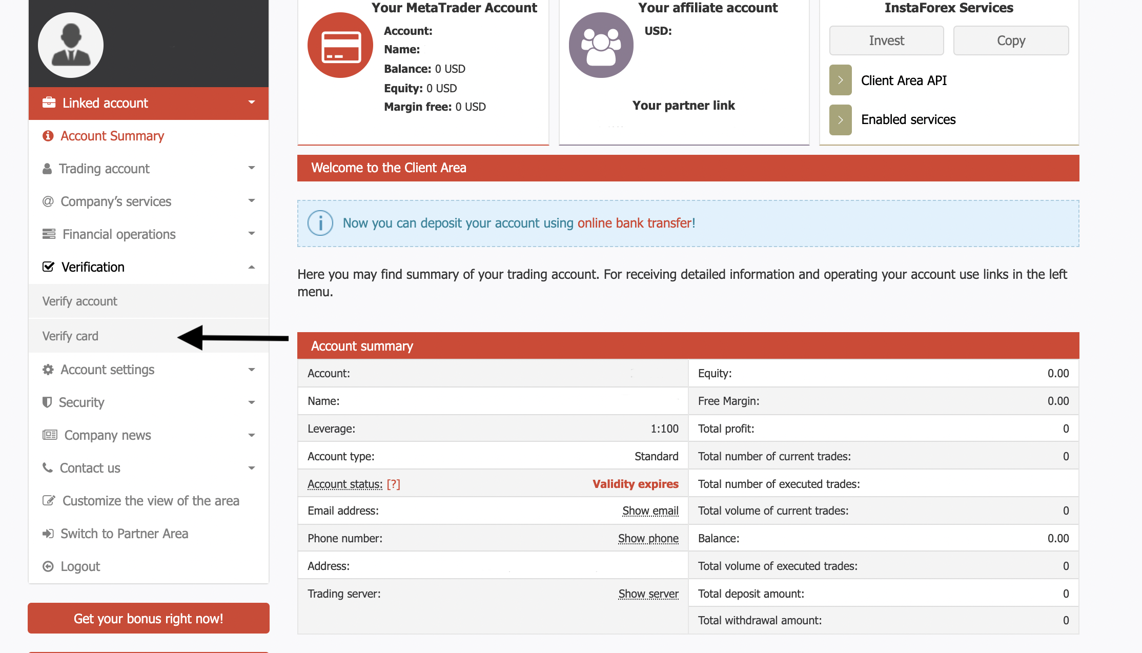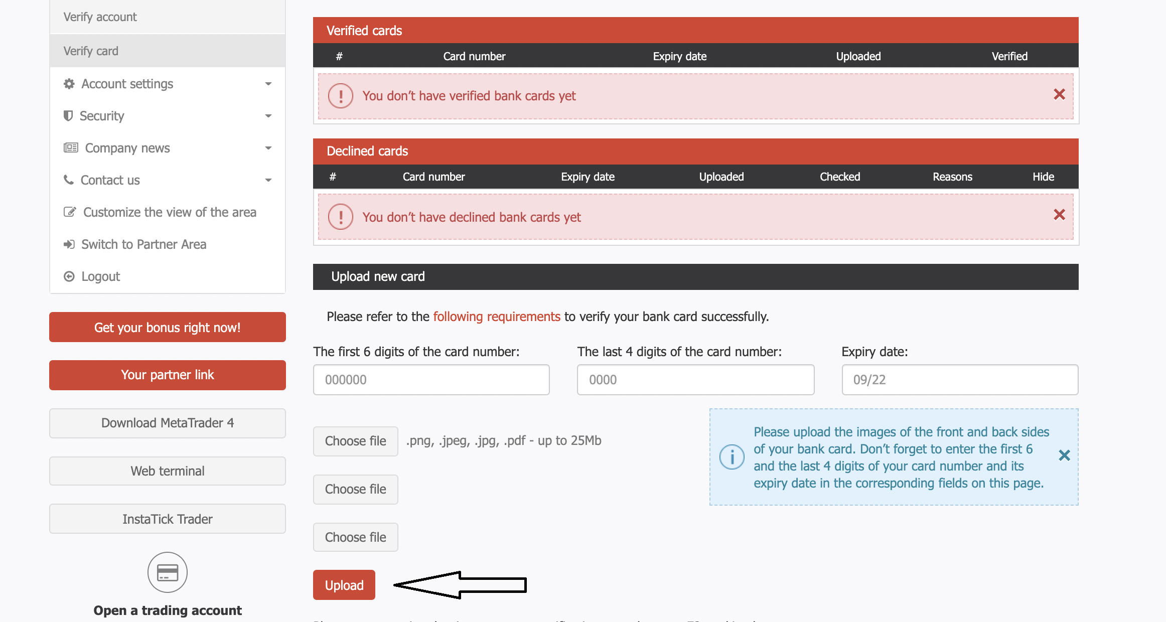 ในการอัปโหลดรูปถ่ายบัตรธนาคารของคุณ โปรดเข้าสู่พื้นที่ลูกค้าของคุณ ให้เลือกการยืนยันในเมนูทางด้านซ้ายแล้วคลิกยืนยันบัตร ในหน้าเว็บนี้คุณจะสามารถอัปโหลดรูปถ่ายด้านหน้าและด้านหลังของบัตรธนาคารของคุณได้ โปรดอย่าลืมปิดข้อมูลที่ละเอียดอ่อนในภาพ